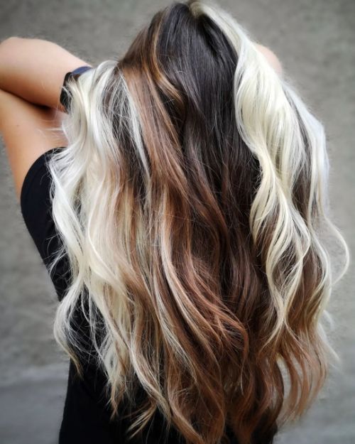 This hairstyle is a perfect example of the soft trend that involves the combination of brown, black, and white colors in natural waves. The warm shades contribute to the autumn feel, offering depth and warmth to the hair. The top part with the slightly blended skunk stripe, which easily goes with the light-up of the flowing curls, makes the hairstyle adaptable to casual and formal occasions.
