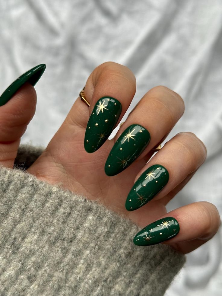 This starry sky motif departs from the classic dark green alone and opts for subtle golden stars and dots that bring a cosmic feel to the 2025 trends. The coffin shape not only digs but also makes the overall style more dramatic, while the bright gold color plays the role of a distorting factor. Belonging to the night, these nails are the best company with free-flowing dresses and gold jewelry, thus they all create a magically beautiful whole look.