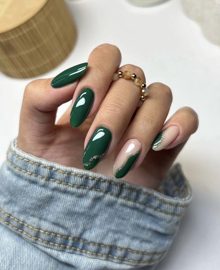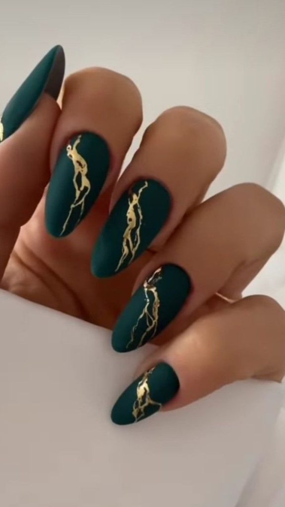 This intricate nail design made of forest green and nude shade looks wonderful with glittery gold wave accents. The almond shape impresses the delicate characteristics of the nails, whereas the artistic details contribute a different feature to them. This design is suitable for women who want to look classy in formal events, as it goes well with gold jewelry and eveningwear.