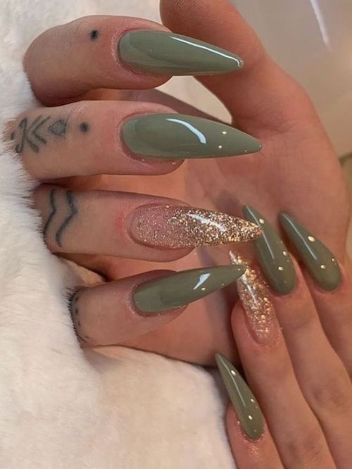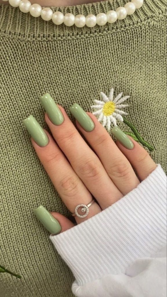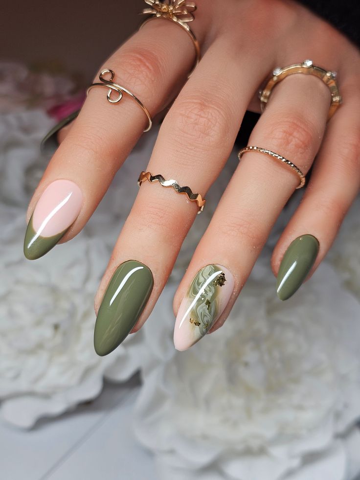 This abstract type of olive green nails is for those who have a desire for a design with boldness and artistic character. The matte surface with flowing gold lines makes this almond shape of nails an ideal mix of modern art and high fashion. It’s a great choice for a person who is interested in expressing their uniqueness with the nails. You might combine it with a tailored jacket or chic blouse so that your hands would articulate for you.