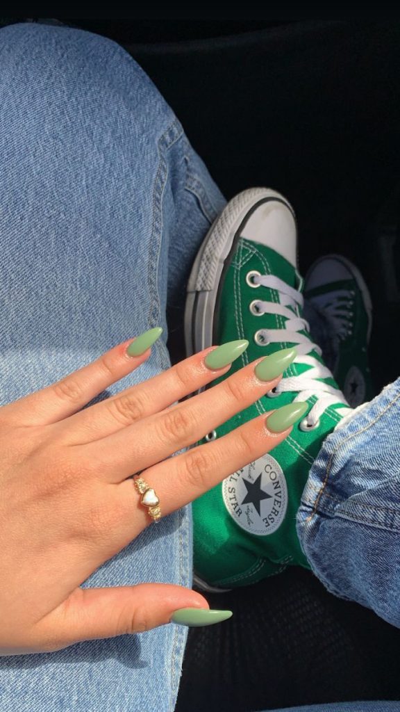 This set of nails with almond-shaped design looks trendy and stylish. The color is a light green shade of soft that goes perfectly with the casual and sporty styles. This idea is for women who like to look stylish but not at the expense of effort coordinating with green Converse shoes. This simple design shows a lot of fresh moods and is perfect with jeans for a casual weekend or spring trip.