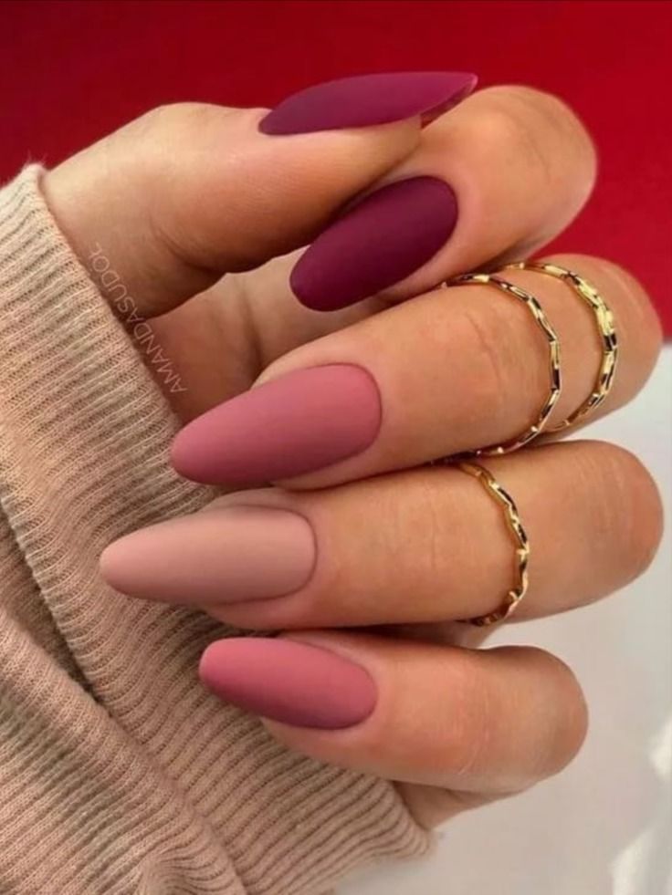 This almond-shaped matte nail art is a fantastic twist as it mixes a gradient of mauve tones by blending soft pinks and deep wine hues to create a trendy and modern look. The warm color palette makes it simple but adds a touch of sophistication, which means it is perfect for both casual and formal spring outfits. It would be a great choice for women who want an uncomplicated yet stylish design with contemporary colors and a minimalist feel.