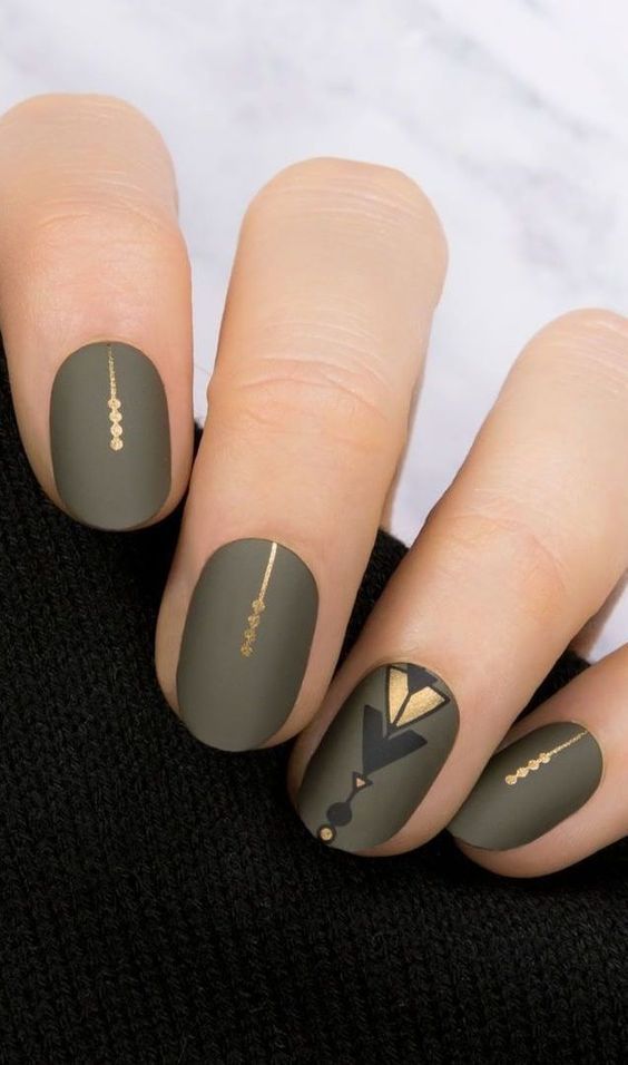 These muted green short matte nails are minimalist gold details like simple lines and geometric shapes. The design is lapidary and modern as it completely shows the balance between simplicity and style for the spring season. The combination of this green and neutral color is excellent for women who are into fashion yet prefer a cleaner look.