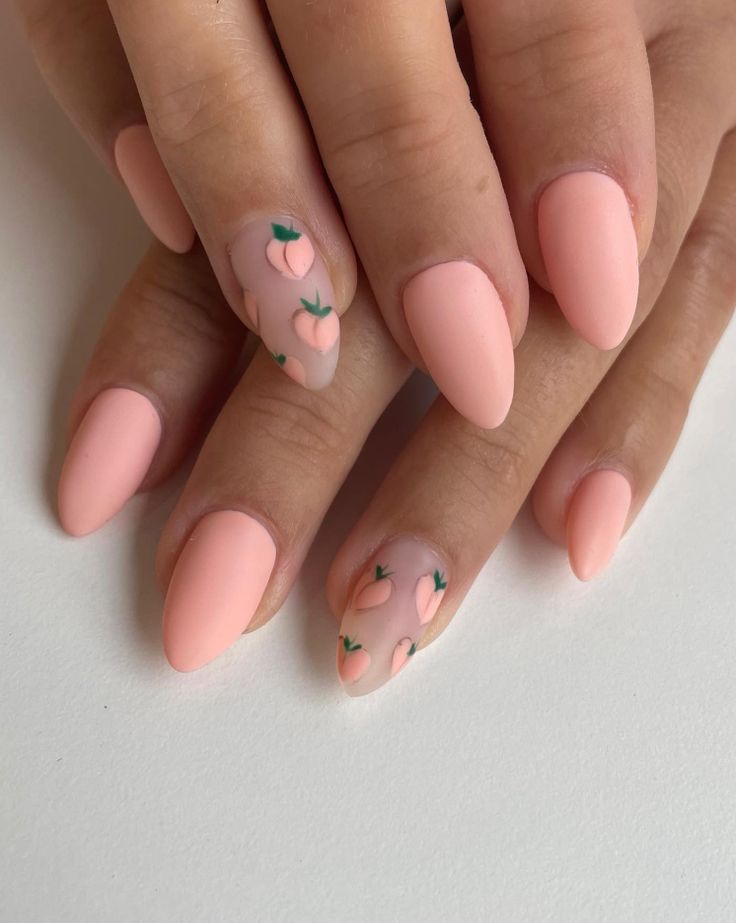 Soilish matte nail art brings out the taste of the soft peach base along with little hand-painted peach fruit details on the accent nails. The almond shape adds a feminine touch, which is why this fun design is suitable for the spring season. The mix of pretty and uncomplicated features takes a cool style to be simple and then felt comfortable with.