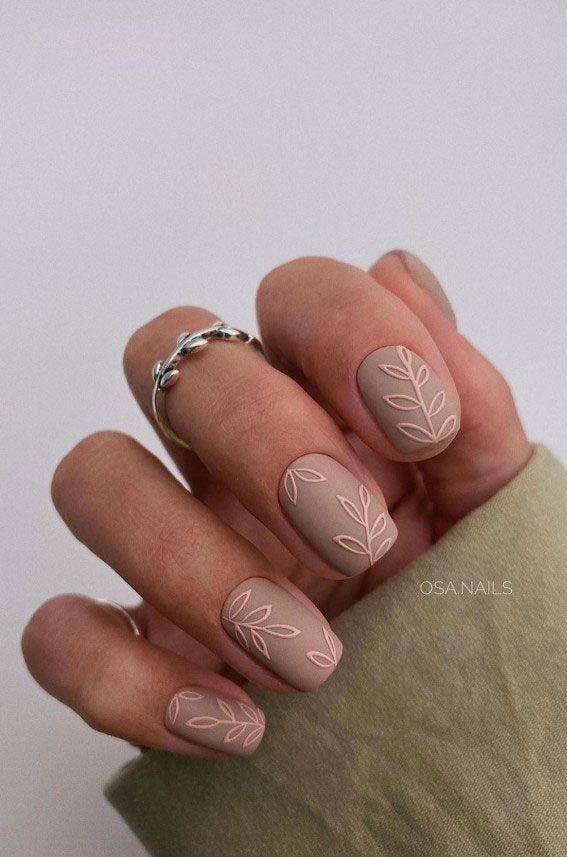 The taupe hue earthy matte pattern is the focus of pale white leaf designs on each nail, which makes it a simple and natural aesthetic. Short nails make this design not only practical but also stylish, which is a perfect choice for those who want a neutral and humble spring look.