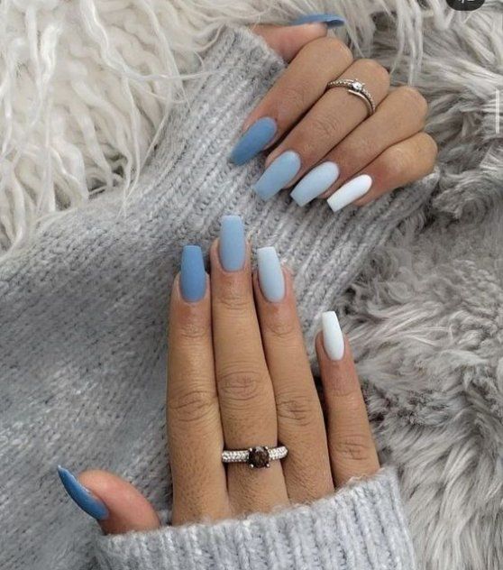 The stunning gradient of matte blue and white colors has made this coffin-shaped nails a very frosty design. The icy tones are a fantastic choice for changing the seasons from winter to spring, providing a bright and clean appearance. The coffin shape emphasizes the sophisticated design and is thus the right choice for women who want to adopt the 2025 trend with a tranquil color palette.