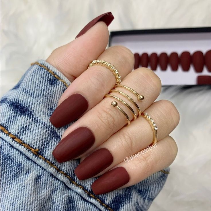Coat of the nails in coffin shape and colored in burgundy matte rich is a perfect expression of classical elegance. This trending deep hue is wearable for evening affairs and a fine add-on for that little extra drama to any attire. Complement these nails with a set of gold jewelry, which is not only an extra pop of elegance but also in harmony with the highlighted red, and design ideas that are coffin-shaped.