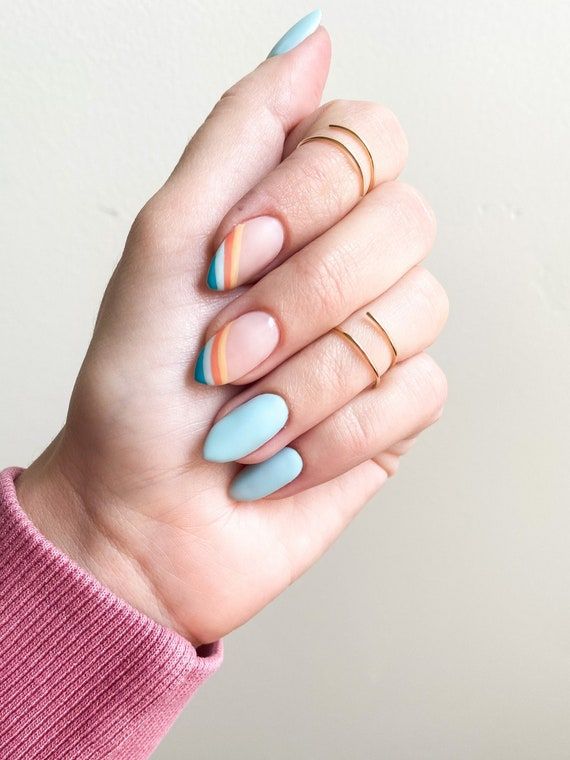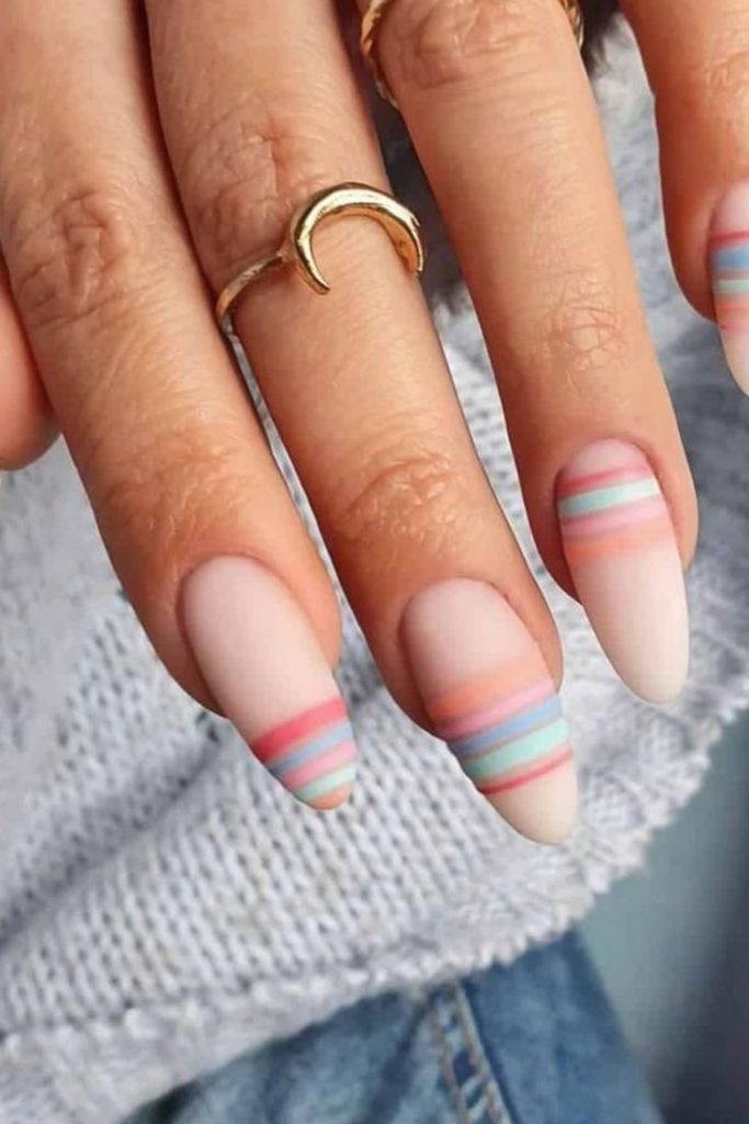 The playful matte style combines a nude axe with colorful horizontal stripes in pastel tones. The almond shape enhances the feminine appeal, while the vibrant accents bring a youthful and lively energy to the nails. The idea is simply fun and practical for spring.