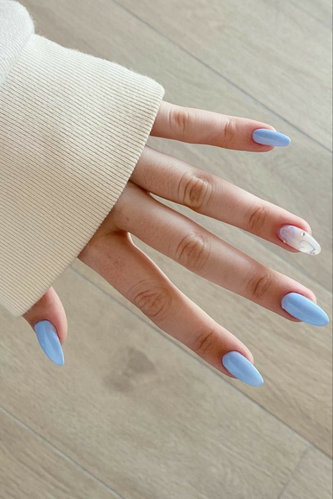 21. Soft Blue Almond Nails with Subtle Marble Accent