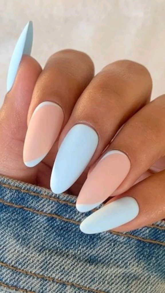 This matte design stands out for its beautiful mix of soft peach and baby blue, creating a fresh and modern look. The almond shape has a beautiful accent that reinforces the elegance of this two colors style, which is a perfect choice for 2025 nail art trends.