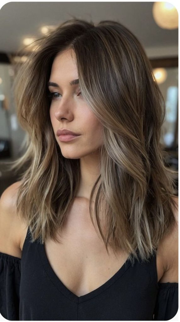 This balayage hairstyle with multiple dimensions is a superb choice for mothers who are looking for a combination of fashion and comfort. The hair length is very flexible and the light curls give a deeper, textured style which is suitable for a formal occasion like a bride’s luncheon or a birthday event. The light and dark shades are cute together, which makes the hairstyle even prettier. A texturizing cream intensifies the definition, keeping the waves fresh all the time.