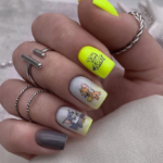 These nails are a sarcastic express of the summer of’ s lively and playful sides. The nails are finger rings with flowers and smiley faces that just scream joy and nostalgia. Besides, the pastel and neon color blocks are just modern for the rainbow tips that came out long ago. Likewise, the dots and heart patterns are a tribute to the ’90s kooky era. It is a nail design that people will stop you to ask where you got it and it will look fantastic with your outfit of bright shades, which is the very thing that a summer day should be.