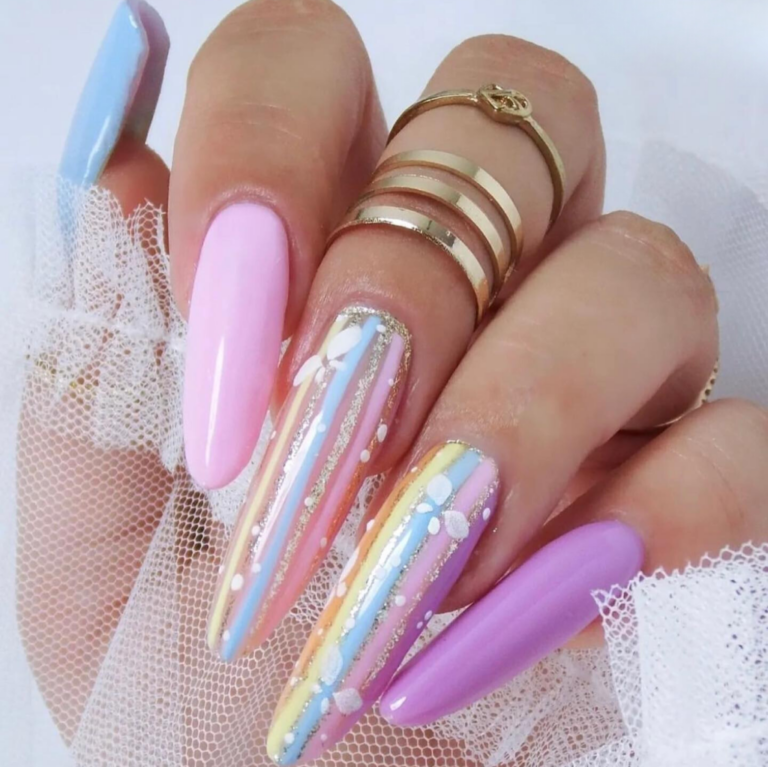 The design that we present is a fast summer rain shower’s enchanting magic. Delicate shades of lavender, mint, and lemon sway in a beautiful array on each nail; they remind one of rainfall (Nature’s the Artist) of a raindrop which catches the light just before a sudden peak of sunlight. The coffin-shaped tips are the added modern touch to the soft color palette, thus, these nails are the women’s modern and fashion-forward choice.