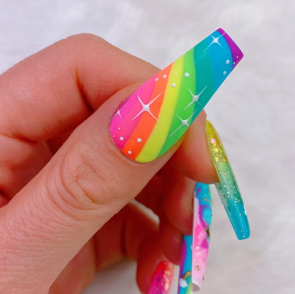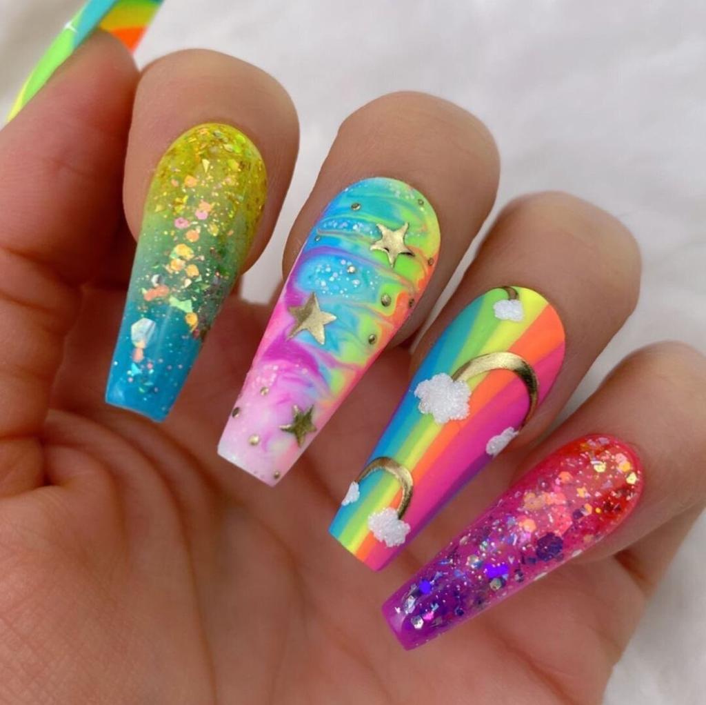 Looking up, we currently appeared in a heavenly stage that shows the spirit of a summer celebration. This template has gone neon in a cosmic way with every nail board telling a different story – from sparkling star-studded blue to sunset orange with golden dots sprinkled. The long tips are the canvases of a color and imagination festival, which is a radiant color spectrum that duplicates the awe-inspiring beauty of the summer sky. Such nails would blend wonderfully with a wind and sun color-blocked maxi dress, thus, you would be the personification of a summer dream.