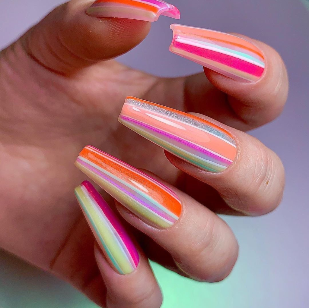 Further on, the beauty of the pink tips during the sunset is a metaphor for the sunset tips design. This is how it is. Every nail projects a well-thought-out strip pattern that diverts into the next one, actually, it is nothing else, but a beautiful summer sunset gradient. The short and even nails make this design both upscale and handy, it is suitable for the woman who is always in a hurry but never gives up her stylishness. The design here is a nod to the striped pattern which is trending in several fashion accessories this season.