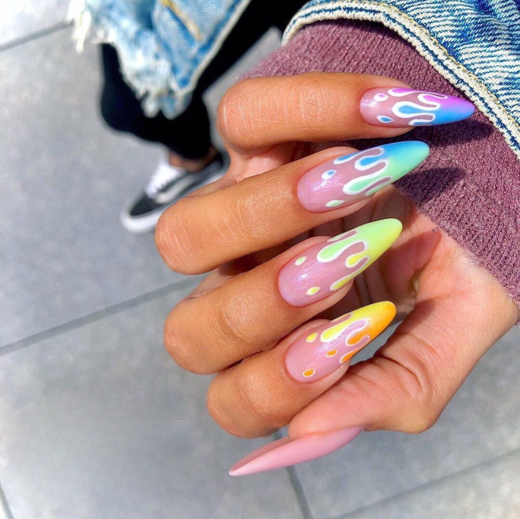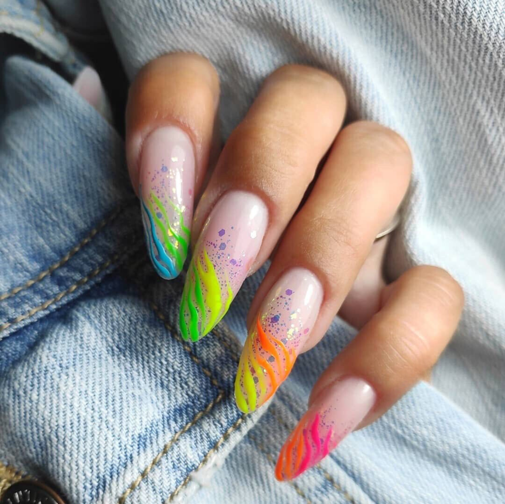 Flowing through the cool, deep aquatic blues to the greenish punch of fresh lime, this design reminds us of the refreshing summer waves hitting the sweltering beaches. The nails are in the long tip style, which is very chic, and each one has an ombre of neon colors that seems to be rippling with movement. The glitter particles remind us of the sunlight that is dancing on the water surface thereby adding up to this design becoming the best complement for a beach day outfit or a casual denim jacket.