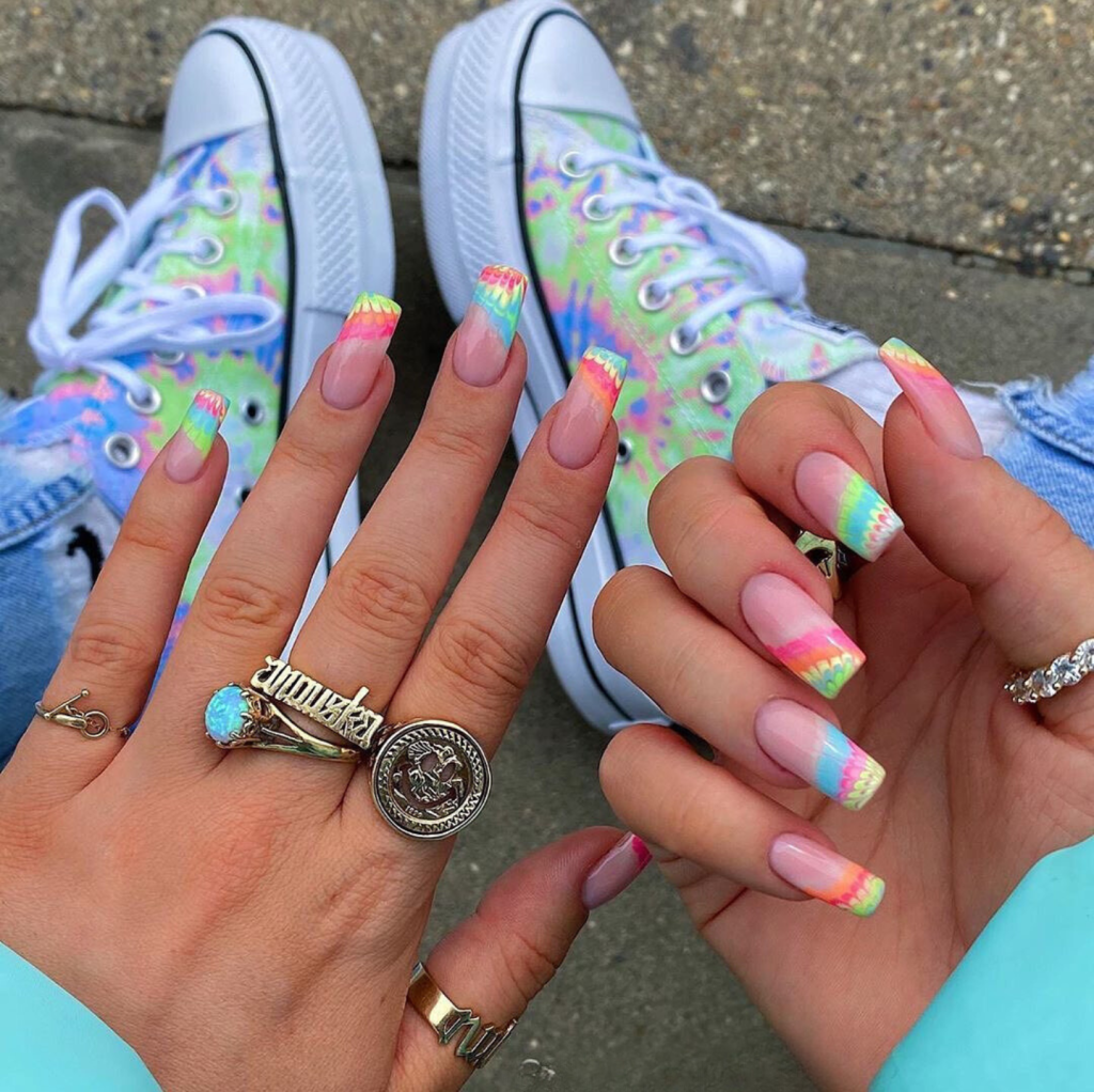 The nails are the embodiment of a summer’s laid-back spirit with an adorable pastel tie-dye effect. The short nails serve as a canvas for a playful mix of soft yellows, pinks, and greens, which form a tie-dye pattern that is both vintage and in vogue. Imagine this design paired with a classic white sneakers and a sundress that flows, it will be a true personification of the light summer day mood.