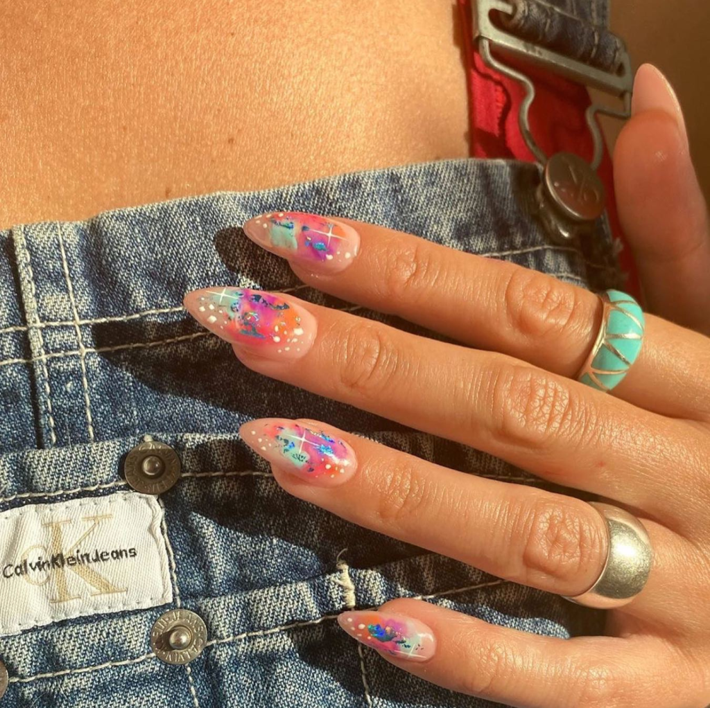 Reminiscent of a painter’s palette, these nails are a burst of color with specks of blue and pink glitter creating a playful splatter effect over a sheer base. The tips are kept at a modest length, making them practical for everyday wear while still adding a touch of whimsy to any outfit. They are the epitome of pastel summer fun and would pair wonderfully with statement jewelry and a bold attitude.