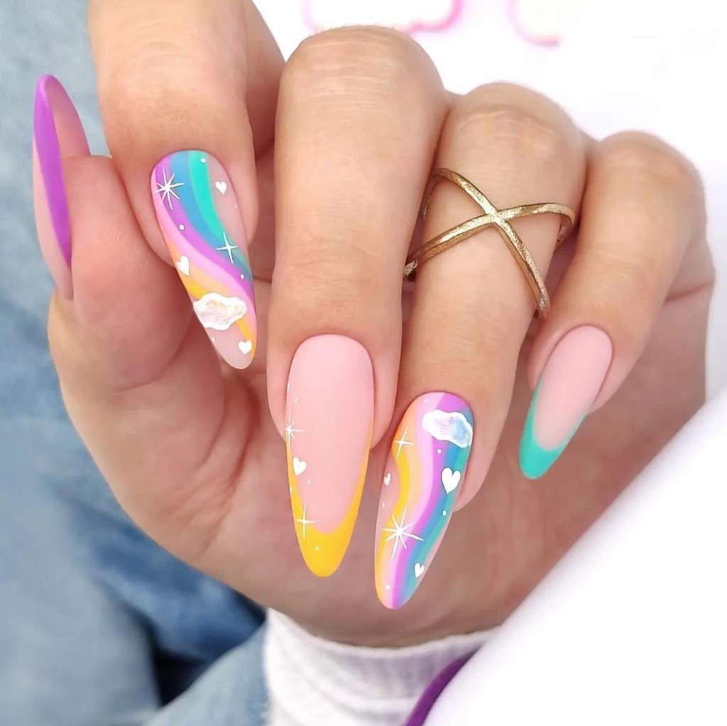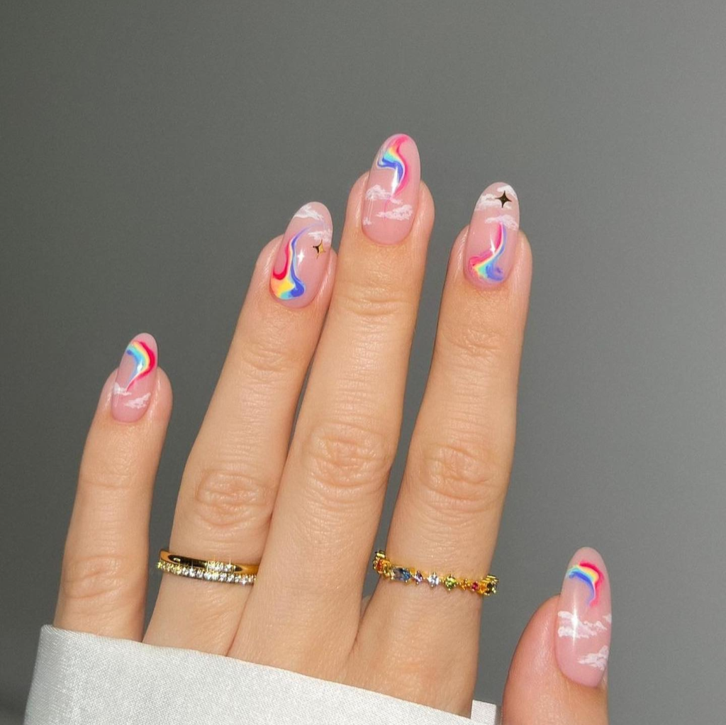 Immerse yourself in a dream with these short nails adorned with figurative rainbow swirls on a delicate pink base. It is similar to someone magically taking a summer day’s joy and spinning this trendy and cute nail art. The minuscule stars cleverly added to the design give it a bit of enchantment making this manicure perfect for all those who wish to bring some fantasy into their daily life. These nails can be matched with sheer, free-flowing materials that create a breezy summery look.