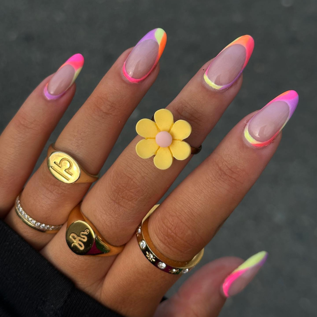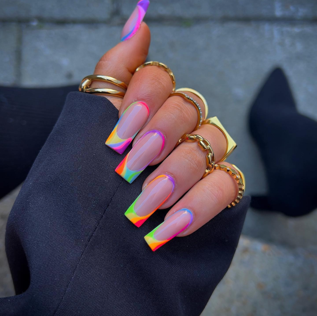 This beautiful layout is witnessed as the soft pastel tips and neon edges blend together harmoniously. Although the short nails are indeed practical for everyday wear, they still make a statement with the strong effect of contrasting colors. The subtle shift that the pastel shades have when accompanied by the vivid colors of neon gives the whole design a sense of being stylish yet a little different. Such a design would fit either a formal outfit or a casual weekend ensemble just as well.