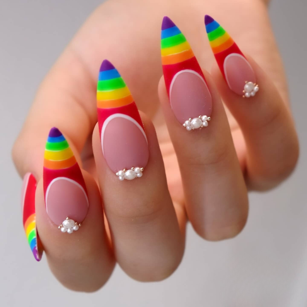 The coffin nails we come across are remarkable, bright attention-grabbing indices of the new style. The clearly rainbow lines that show the feminine side of advanced style that is both brave and chic explain the idea well. The matte pastel base which is contrasted with the rainbow stripes gives a feeling of the surface being very different, therefore, it is very beautiful visually. Completion with beaded flat pearls, these nails are the model of classy summer and can be the highlight of a fashion evening all on their own.