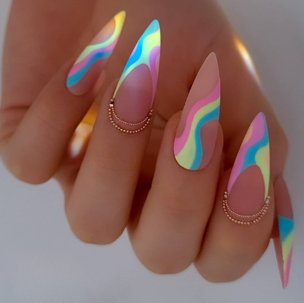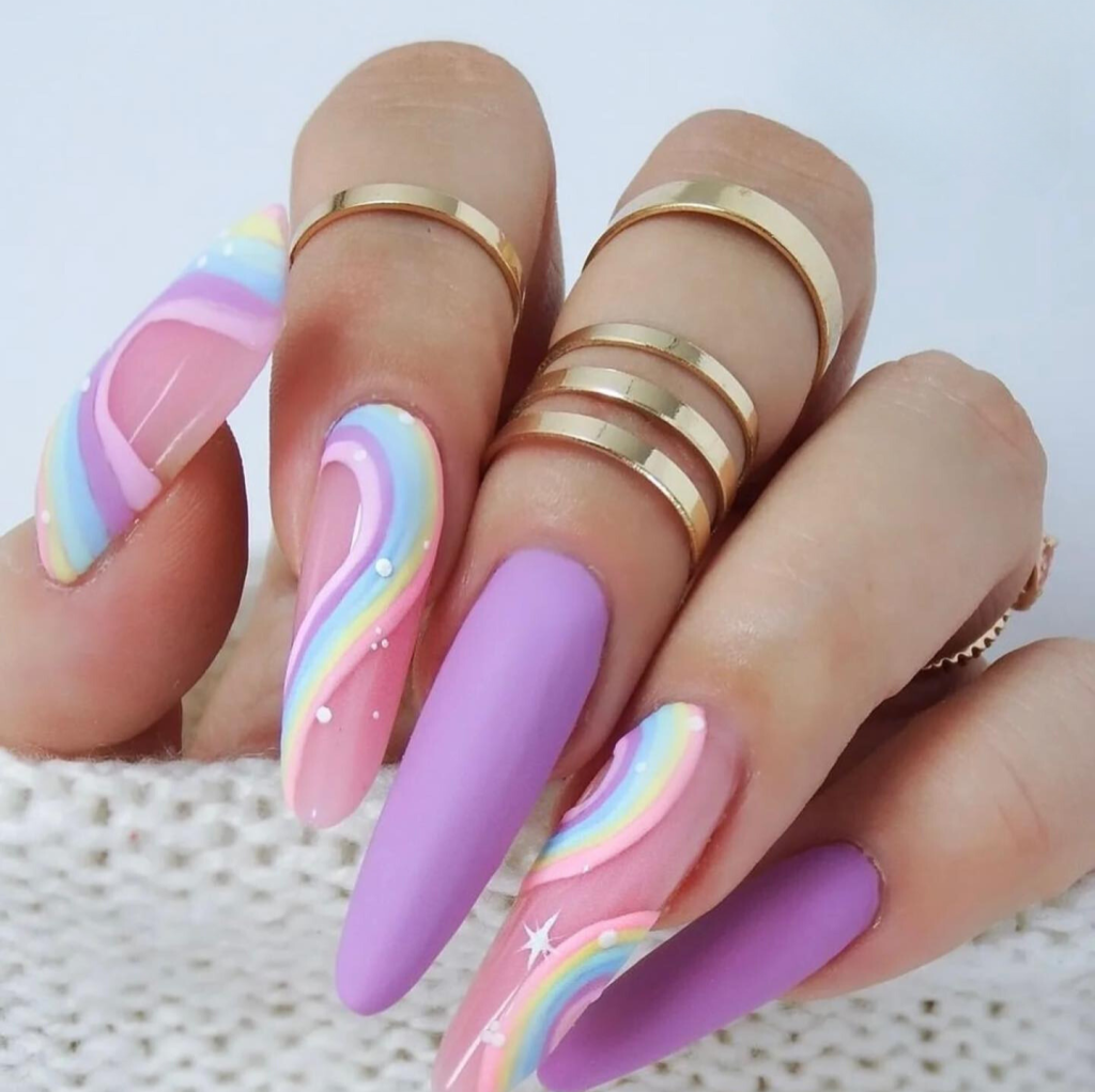 This kit offers an exquisite mix of pastel lavender with rainbow-colored waves, giving the nails a dreamy and cool look. The long tips cater a lot to the visual of the clever movements that look like dancing over each nail. This art design is the perfect match for summer dresses and loose skirts, with a little bit of glitter that resembles the summer days casual shine.