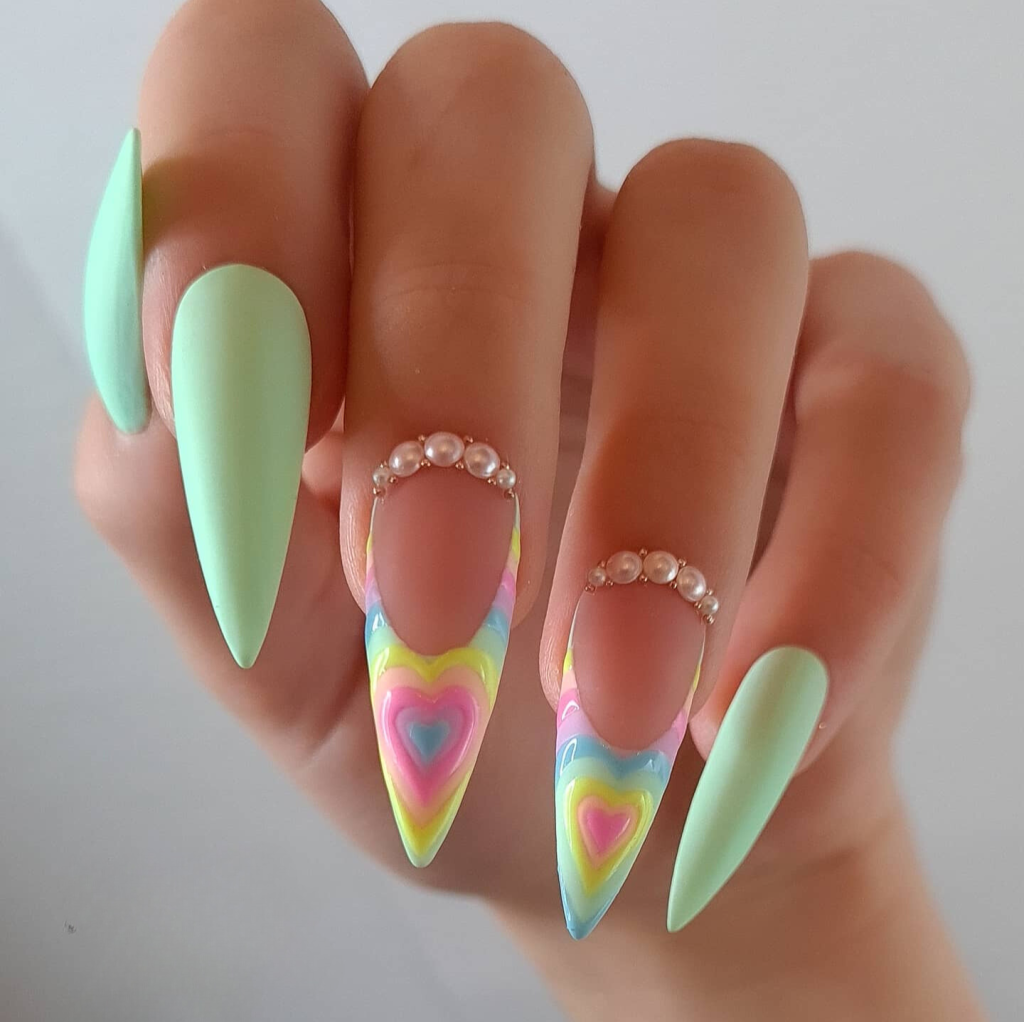 After that, we come across a design whose heart-shaped cutouts are lined with delicate glitter and which is a sweet whispers of love. The tips were previously long and made a good contrast playful between soft pastel matte finishes and the glossy vibrance of heart accents. These nails would go with a summer romance or a casual daytime date, they are pairing with light fabrics and floral patterns just great.