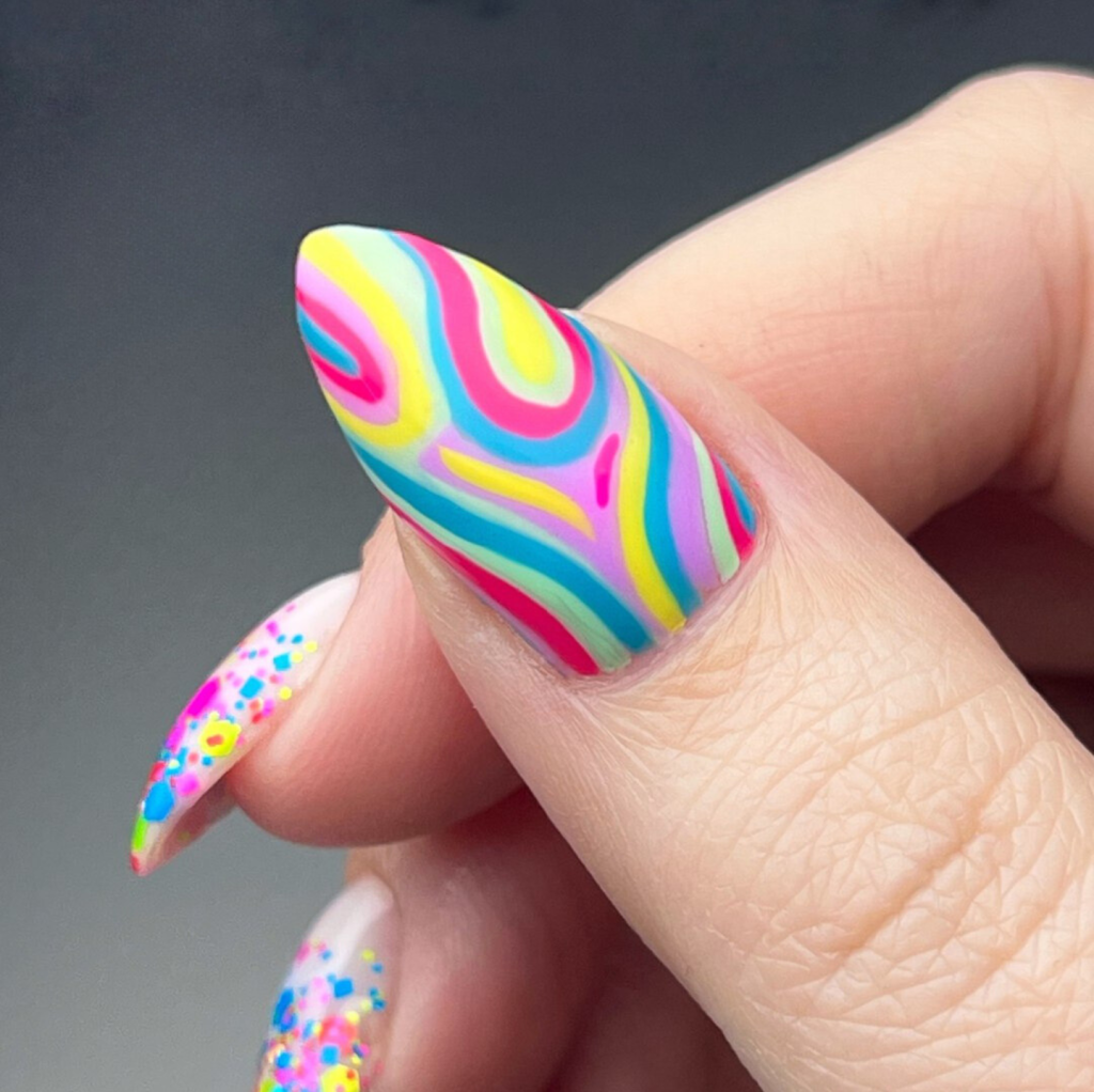 Get into the funky summer vibe with these neon-accented nails, all of which have spirals of bold, psychedelic patterns on them. The contrasting colors are definitely a feast for the eyes, looking a lot like those carefree summer music festivals and colorful beach interactions. These vibrant nails can be worn with a classic combination such as a pair of retro glasses, a tie-dye shirt, or even to surprise others, with a black sleek evening dress.