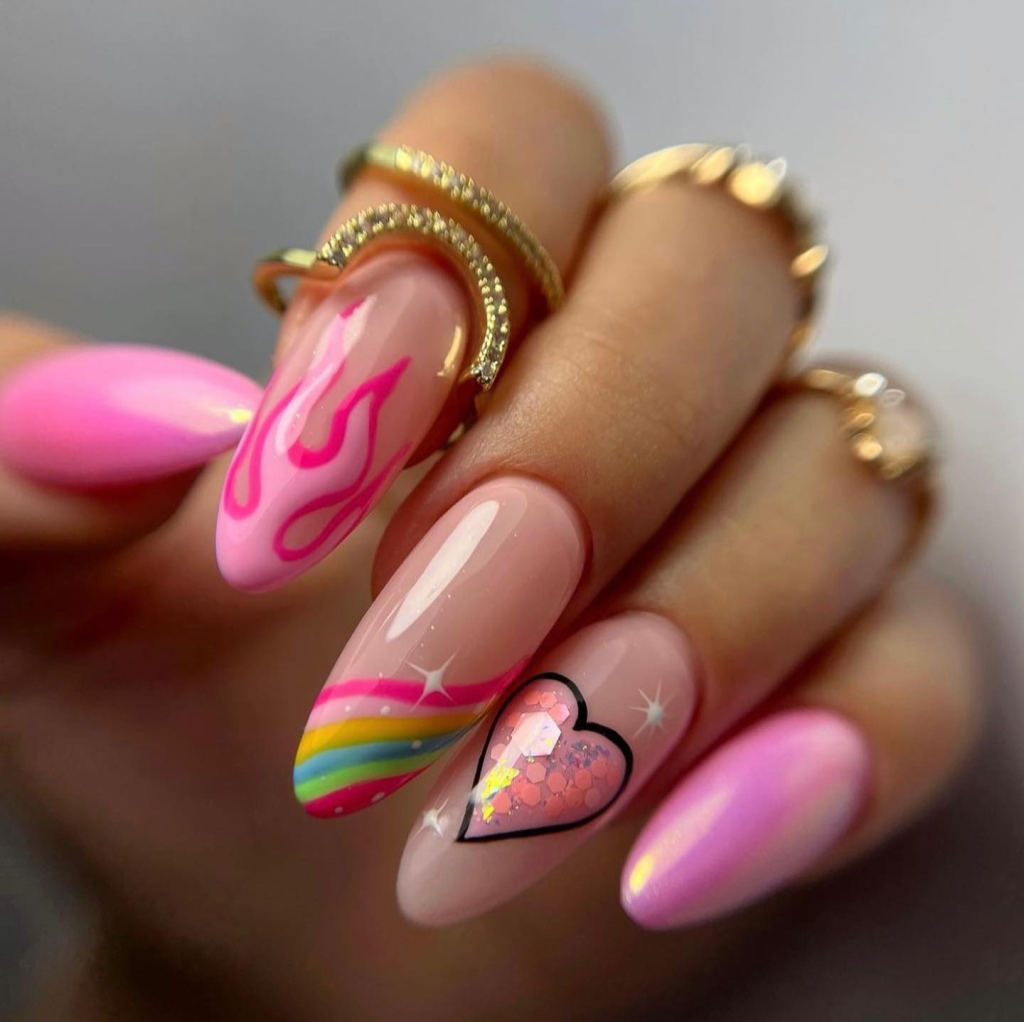 Our series graphic is a proof that whimsical charm exists, it displays all pastel pinks with feathery rainbow tips. Glitter heart gives a totally magic feeling so this design is suitable for the dreamy and the well-dressed romantic. Your wardrobe can be suited to this nail art design with light chocolates or soft pinks, which would be cool, adding the magic touch of fun to your summer wear.