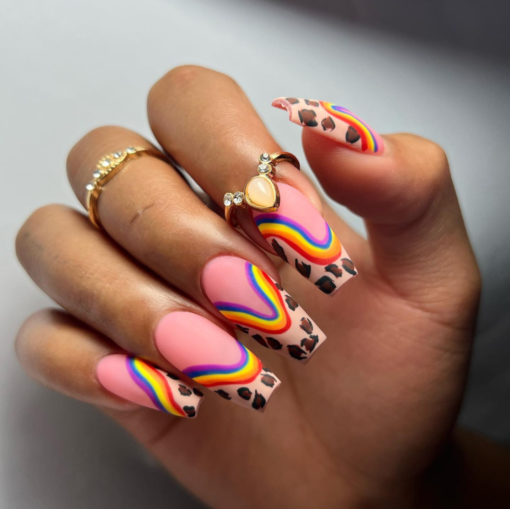 The final design in our series makes a bold statement with its combination of vibrant rainbow waves and a classic leopard print. It’s a design that speaks to the adventurous spirit of summer, merging trending animal prints with the joyous color spectrum of a rainbow. This manicure would look stunning with both monochromatic outfits to let the nails stand out and colorful patterns to complement the nail art’s playfulness.