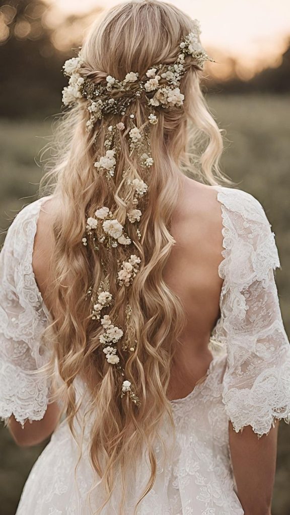 9. Romantic Half-Up Style with Baby’s Breath Accents