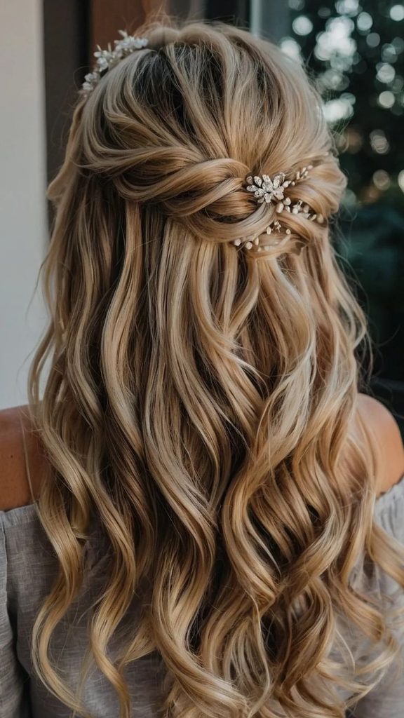 23. Glamorous Wavy Half-Up with Crystal Accents