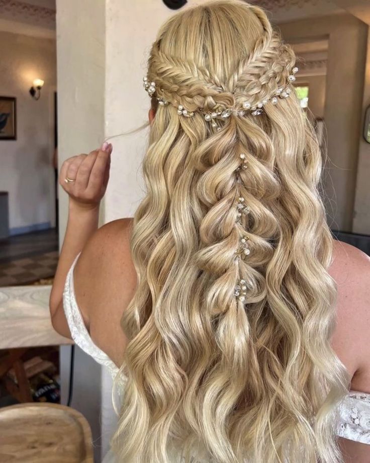 This is a distinct hairstyle that blends fishtail braid with a few sections of tiny loops and is all pinned up in a half-up style with little pearls decorated all over. The detailed braid structure is perfect for long hair since there is enough length for the different parts to be seen. The hairstyle’s fantasy feeling gives it a chance to be popular in 2025, making it a good option for brides who want an innovative alternative to the classic bridal hairstyle. Pearls infuse it with a sense of elegance and thus it is appropriate for both formal and bohemian themed weddings.