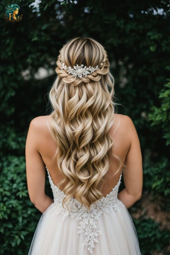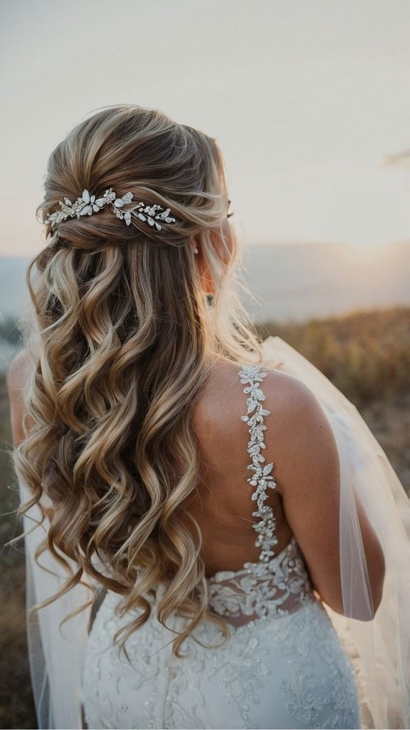 This charming hairstyle that has half up with sections twisted has been made keeping in mind the propriety and practicality. The addition of twists has made it look more of a trendy 2025 bride choice, special but not too overly formal at all. This look helps the brides with long hair who would prefer keeping some parts of their hair down as it gives a more casual and relaxed feel. It looks stunning with lace dresses and, besides, it can be matched with a veil or decorated with floral accessories for a bohemian look that is quite easy to acquire.