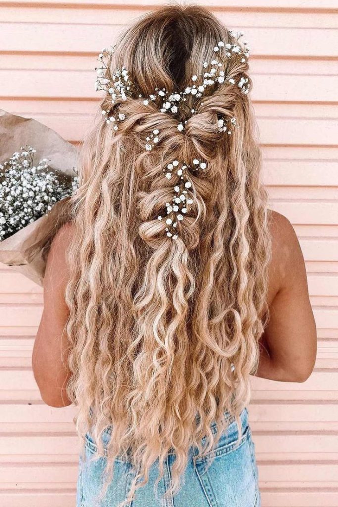 The dreamy and romantic effect of the half-up style loosed hair with the addition of baby’s breath accents makes this style a bright boho hairstyle. The gentle curls add more beauty to the long hair and make it look fuller. This girl’s hairstyle is a good choice for brides who are searching for a natural but stunning hairstyle with a country touch. It fits outdoor events well and it looks so good with light, smooth dresses. The baby’s breath reflects the brightness and lightheartedness, which gives the style a feeling of being both natural and elegant.