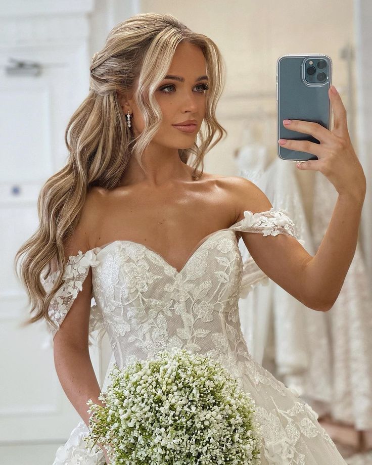 The soft, curly hair that is left up and the waves that frame the face, this style is excellent for the bride with long hair, who looks like this and is well-matched to an off-the-shoulder dress. The waved hair at the front gives a soft and beautiful look, thus this style is perfect for brides who wish to wear some hair down and yet, add a formal touch to their look.
