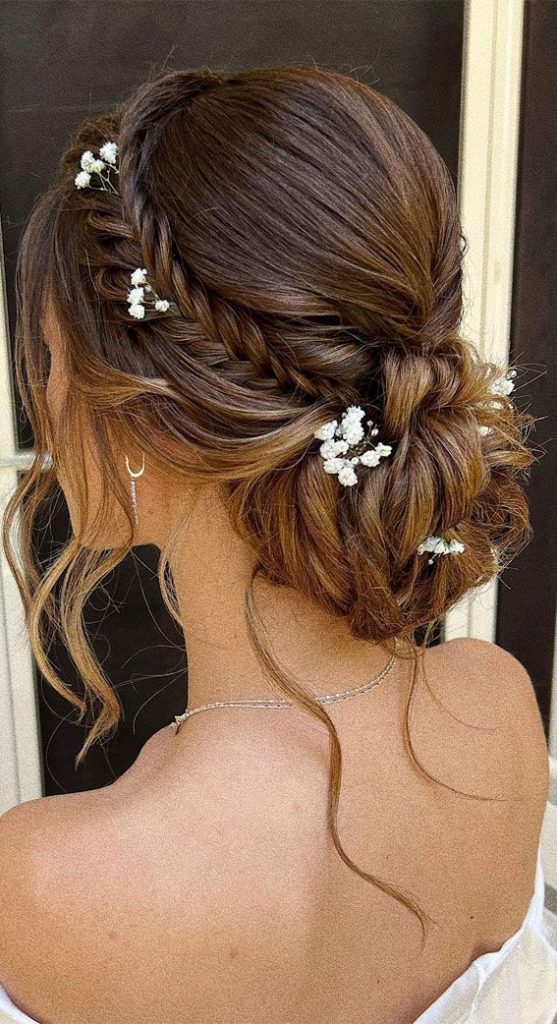 The hairstyle comprising of half-up and full-up twists is simple and beautiful thanks to the delicate twists that are adorned with the cute little flower baby’s breath. The twists also bring texture and also hold the hair in place, so it works well for both medium and long hair. The baby’s breath is an excellent addition to the soft waves, which further enhance the romantic and fresh look of the hairstyle. This idea is just ideal for those brides looking for a simple, yet, intricate hairstyle, particularly, at a rustic or garden wedding.