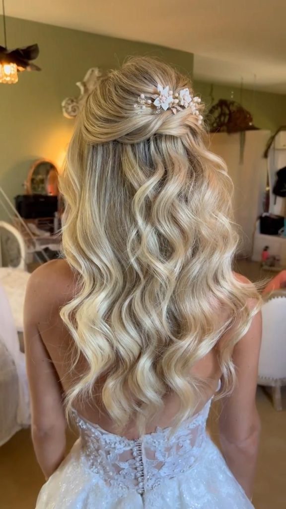 This breathtaking half-up top style has the twisting strands are brought together by a super beautiful flowered hair clutcher, thus it is so tender and luxurious at the same time. The roaming waves give the hair more volume and dynamic, that is why it is the best option for long-haired brides who want to look formal yet relaxed at the same time. The hairpiece used is a floral comb, of which, the beauty stands out most distinctly, the shine and the distortion that it creates makes you think of it as if it was a magic wand that transforms a wedding dress into a starry night gown or a boho style dress. This hairstyle can also be a good fit for the formal indoor weddings and outdoor celebrations.