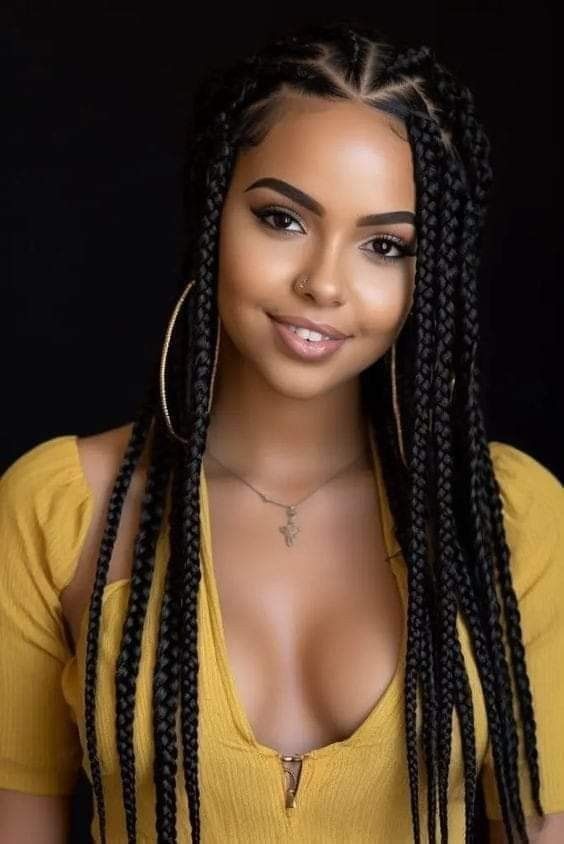 The eye-catching hairstyle is the one that joins long box braids with bouncy curls at the ends. The braids are cleanly parted and beautifully frame the face while putting the accent on the wearer’s features. This style, which is both protective and chic, is ideal for black women and can be worn on a daily basis or at special events. A little bit of shine serum will help you keep the curls – looking fresh and polished all day long.