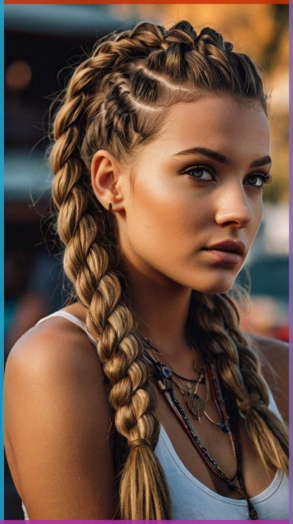 The side braids tight chips are the edgy part of the whole look, whereas the look is quite feminine since the hair is loose blonde waves that are down the back. The addition of the braids to the crown makes it tough, while the soft waves create a sense of comfort, making the style look relaxed and glamorous at the same time. This hairdo is very much suitable for young girls or people going to summer festivals. It can be used to express a playful and professional image at the same time. You can really bring this look to life by teaming it up with enormous earrings or adding a touch of glamour through minimalistic makeup.