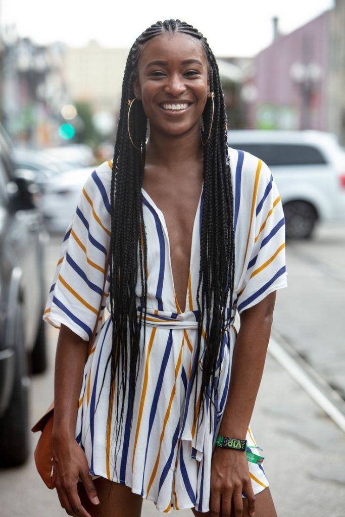 Super sleek and elegant, these ultra-thin braids are the epitome of discriminative style and free-fall. The hairstyle is for black women only and though it is very simple and modern looks. It is ideal for summer hangouts or festivals, it can be matched easily with bright, free-flowing clothes. To make it look more glam this hairstyle can be transformed by simple bead embellishment or metallic trinkets.