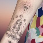 Featuring the iconic frontman of The Doors surrounded by intricate mandala patterns and an all-seeing eye, this tattoo represents a fusion of artistic vision and spiritual insight. It’s a homage to Jim Morrison’s enigmatic presence, while the mandala and eye symbolize enlightenment and awareness. This tattoo is perfect for those who admire Morrison’s influence and seek a meaningful statement.