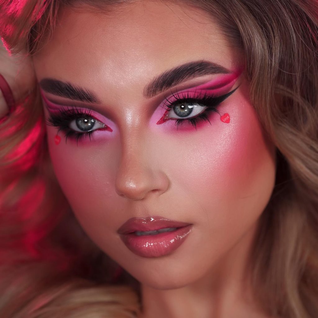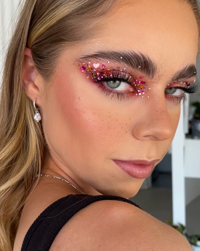 This sweet and charming, romantic, and whimsical look is an idea for you that combines two colors red and pink. The colors blended are all very soft, making the whole thing dreamy and ethereal, thus giving it the perfect look for romantic dates or festive gatherings. The inclusion of small heart-shaped gems makes a playful and festive touch. This makeup is most stunning for blue-eyed girls because the warm shades add a glow to their eyes. The color palette of this one is vibrant, and it’s easy to follow with a detailed tutorial.
