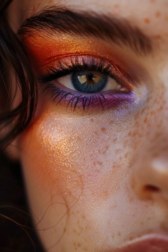 This view is reminiscent of a gorgeous sunset and is made of warm oranges and cool purples located in a stunning painting. The addition of blue to the color palette makes the results look great and this kind of makeup is good for any celebration. This particular type of makeup is even more effective in blue eyes, where they can be represented in two different colors of the spectrum. A few easy steps to follow can guide you in making this cheerful and vivid style of makeup.
