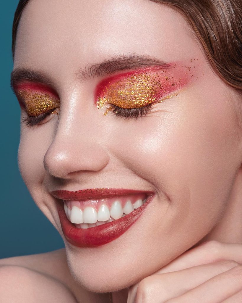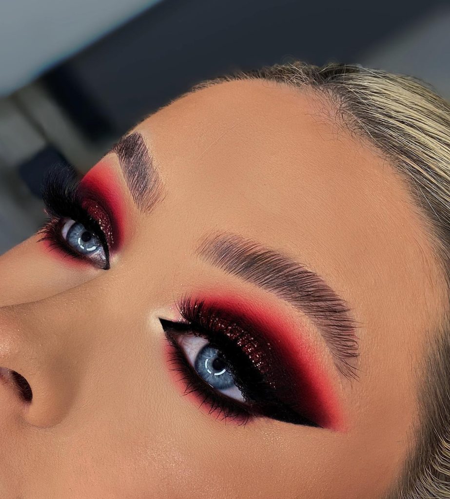 This makeup style is all about the theatricality and the strength, the two contrasting colors red and black essentially reference the boldness. The eye makeup that is responsible for the red-eye look is combined with the black eye shadow so the application becomes smoky and sexy. This is a great idea for night parties and celebrations where you want someone to remember you. The inner eye glitter not only adds a shining effect but also creates a festival touch to the overall look. This eye makeup is particularly beautiful on the eyes with blue color, which are highlighted with the differentiation of colors.