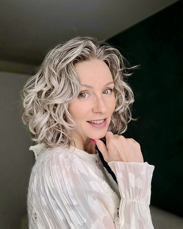 Here’s a playful and voluminous take on curly hair, ideal for women who embrace their natural texture. Wavy hair types will benefit from this cut, which emphasizes gray hair while promoting dimensional elements and looser textures. This cut works on both square and round faces, creating an energetic look that is easy on the eyes. Perfect for brunches, gallery strolls or simply enjoying your day with flair, this cut feels fresh and relevant for 2025 while remaining deeply personal.