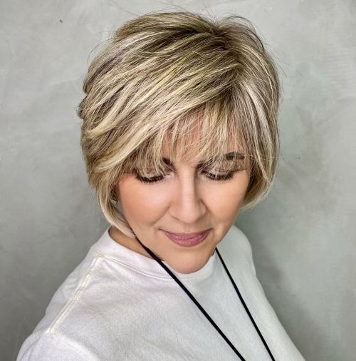 This short, layered pixie bob blends cool, gray-blonde tones with energetic texture to create volume and movement that works well with fine, wavy hair types. Side-swept fronts and tousled tops create a vibrant style that goes great with glasses while maintaining a sleek, modern look. It’s also wonderfully low-maintenance, perfect for busy mornings without compromising on fashion-forward style.