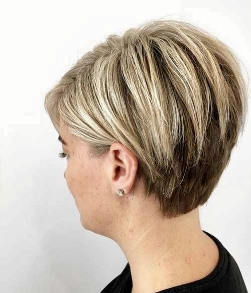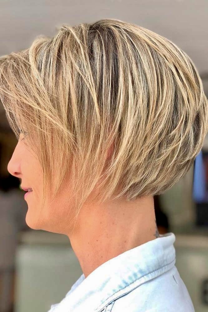 This clean, practical cut is designed to flatter fine hair while maintaining volume at the crown. Fine hair, along with straight hair types and individuals over the age of sixty, will benefit from this style due to its subtle layering techniques and tight nape taper that creates a stylish yet textured shape. The warm blonde highlights add texture and dimension to the style, making it both functional and fashionable for women who love minimal styling.