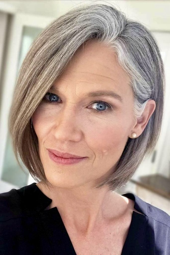 Here’s a striking example of embracing natural beauty with style. A neatly parted bob is stunning on those with gray or silver hair, creating an elegant look that works beautifully on square-faced individuals with thin hair. It’s a sophisticated yet simple choice for women who want something clean and timeless that exudes quiet confidence in both professional and casual settings.