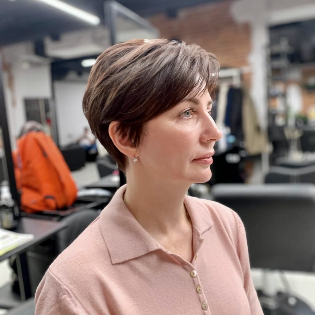 Elegant in its simplicity, this rich brown pixie features soft, side-swept bangs and a neatly sculpted shape that’s ideal for fine-haired, oval face types. This style maintains a clean silhouette due to the precise parting, but the length of the front allows for hairflow aesthetics and slight movement. This is a particularly easy style to maintain-perfect for women who want a classic, unfussy style that still has a polished, 2025-appropriate vibe.